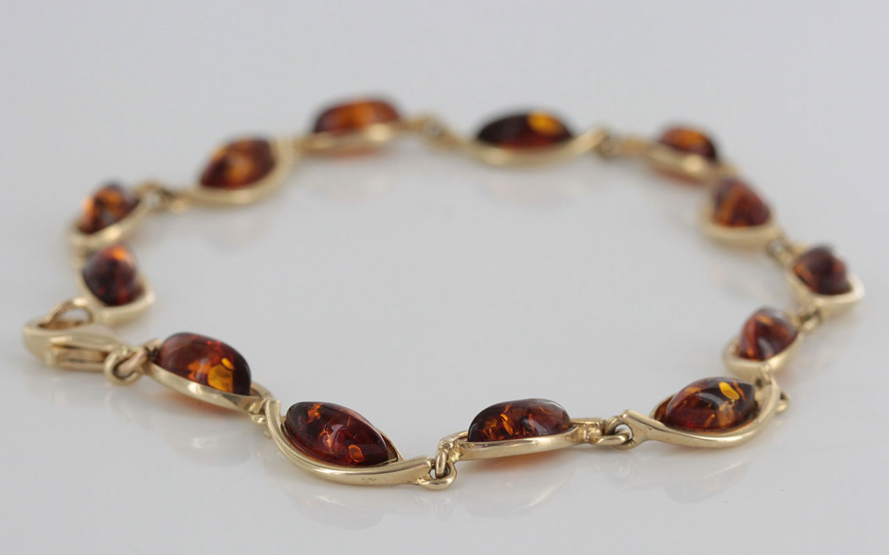 This exquisite bracelet has German Baltic amber pieces. The pieces are styled in an oval shape. With its Italian-designed modern 9ct solid gold finish, the modern setting with the antique amber gemstones is placed on the bracelet. An elegant piece, ideal for all occasions.