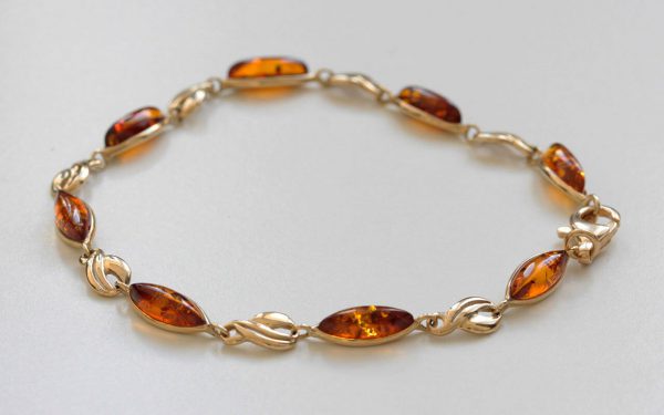 This exquisite bracelet has German Baltic amber pieces. Each piece is oval in shape. With its Italian-designed modern 9ct solid gold finish, the modern setting with the antique amber gemstones is placed on the bracelet. An elegant piece, ideal for all occasions.