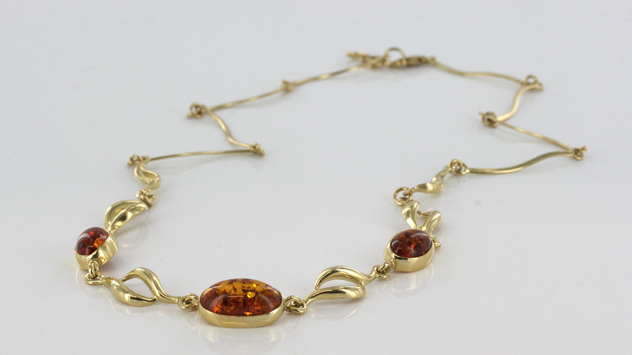 - Baltic amber pieces are perfectly complemented by their elegant gold settings.