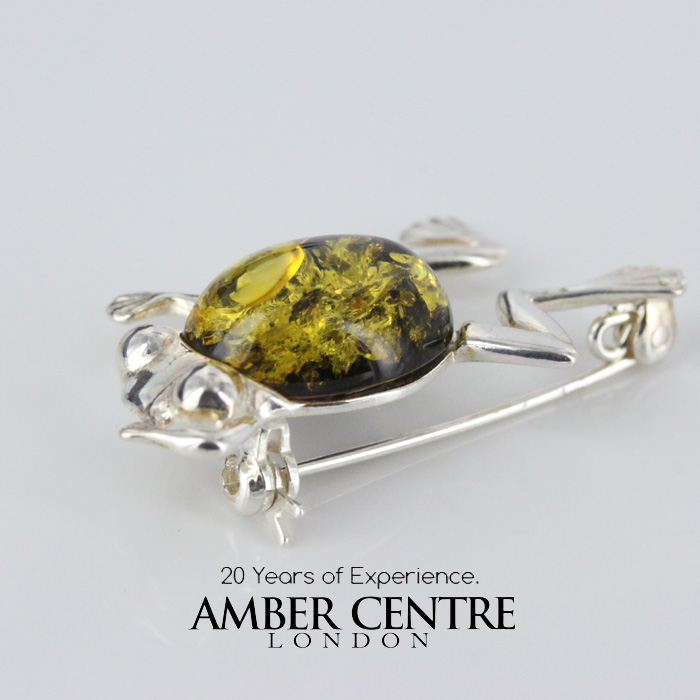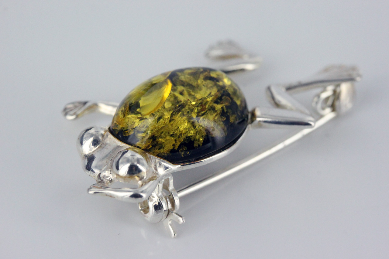 The green Baltic amber is complemented by its frog-shaped silver setting. The Italian-style brooch has been handcrafted to provide the most intricate details. This beautiful piece has been cut to highlight the natural inclusions of the amber. The amber is beautifully complemented by the 925 sterling silver setting. Amber is a naturally occurring stone known for its beauty, made of organic material which contains natural oils and succinic acid.