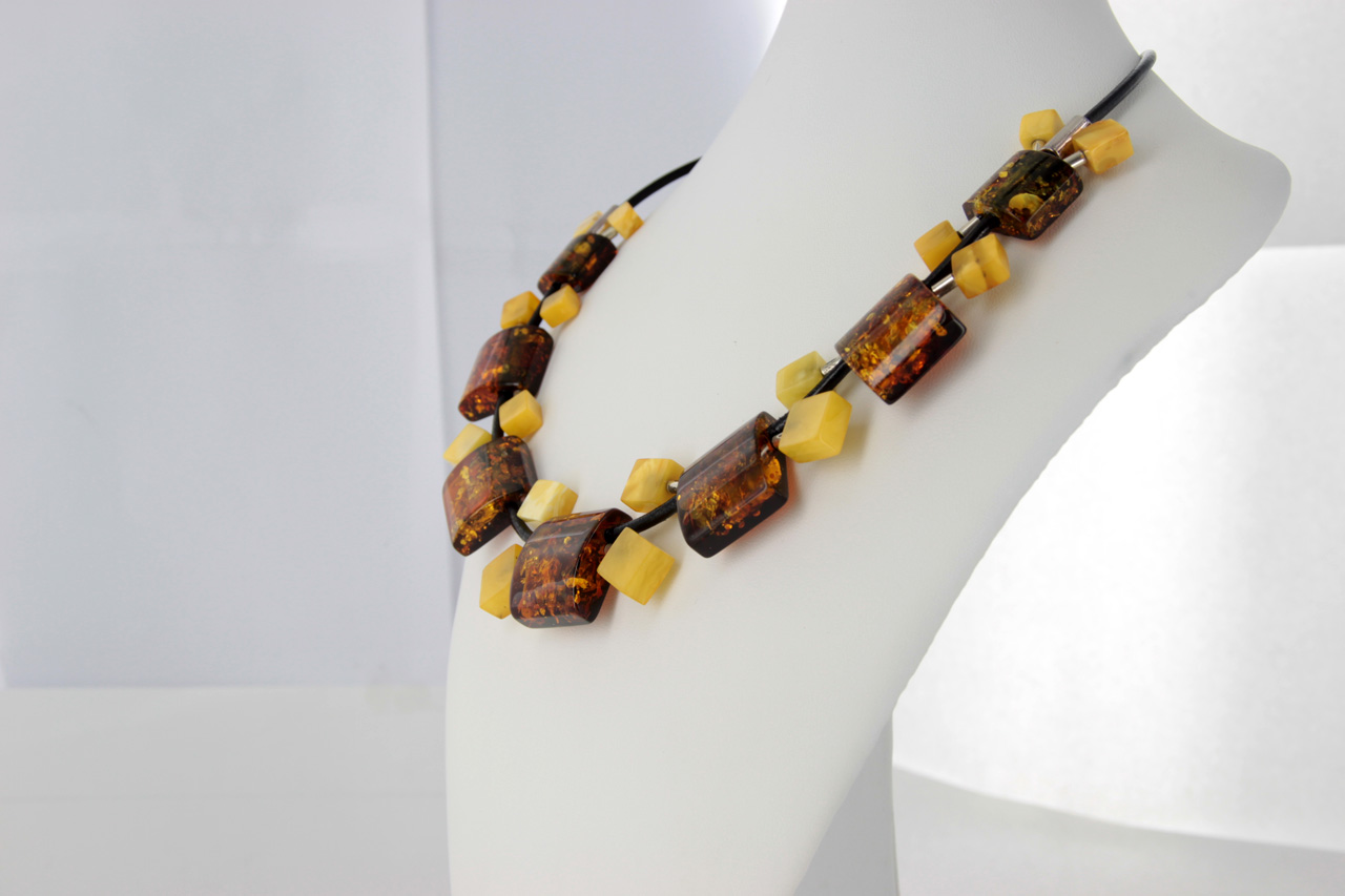 This unique piece has delicate pieces of amber decorated all along its black leather chain. Each amber piece is unique, from stones of a lighter orange tone to stones of a butterscotch amber. The necklace comes in its original Amber Centre packaging.