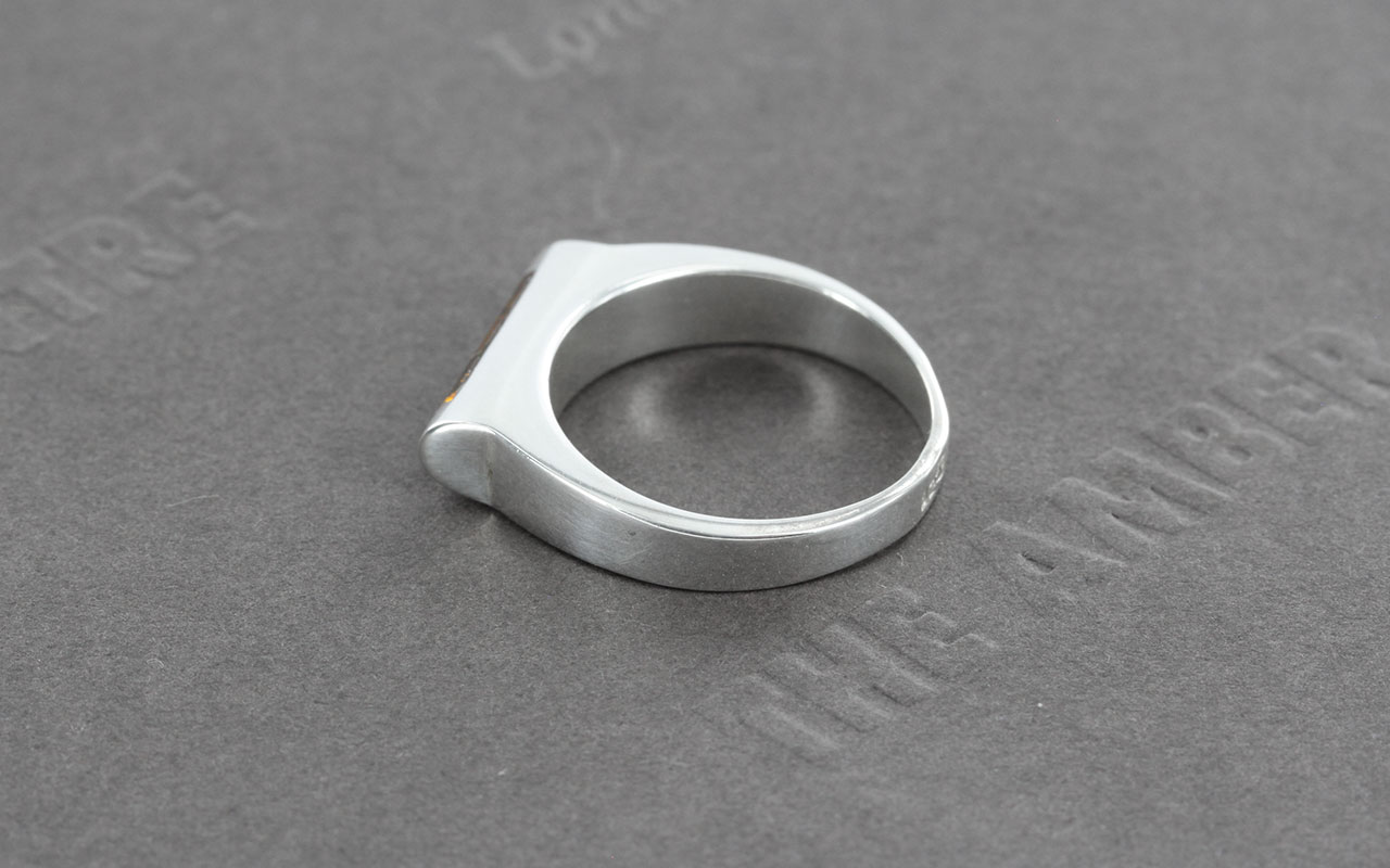 The contemporary design of this piece makes it a very unique ring. The tubular slit of the amber subtly shows the rich tones of classic cognac Baltic Amber. The amber is antique and has been preserved to include all its natural inclusions; emphasising the natural beauty of the amber.