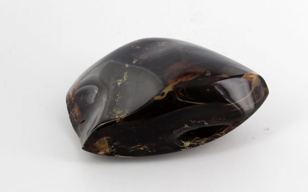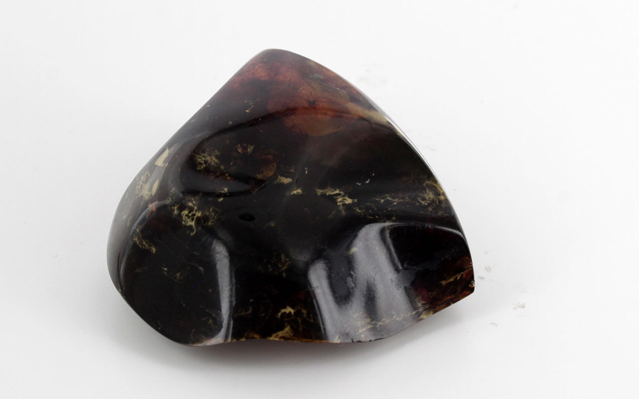 This individual amber has dark red tones, with orange and brown hues. As it is smooth and irregularly flat in its shape, the piece is very unique. Ideal for making your own jewellery or for a collector.